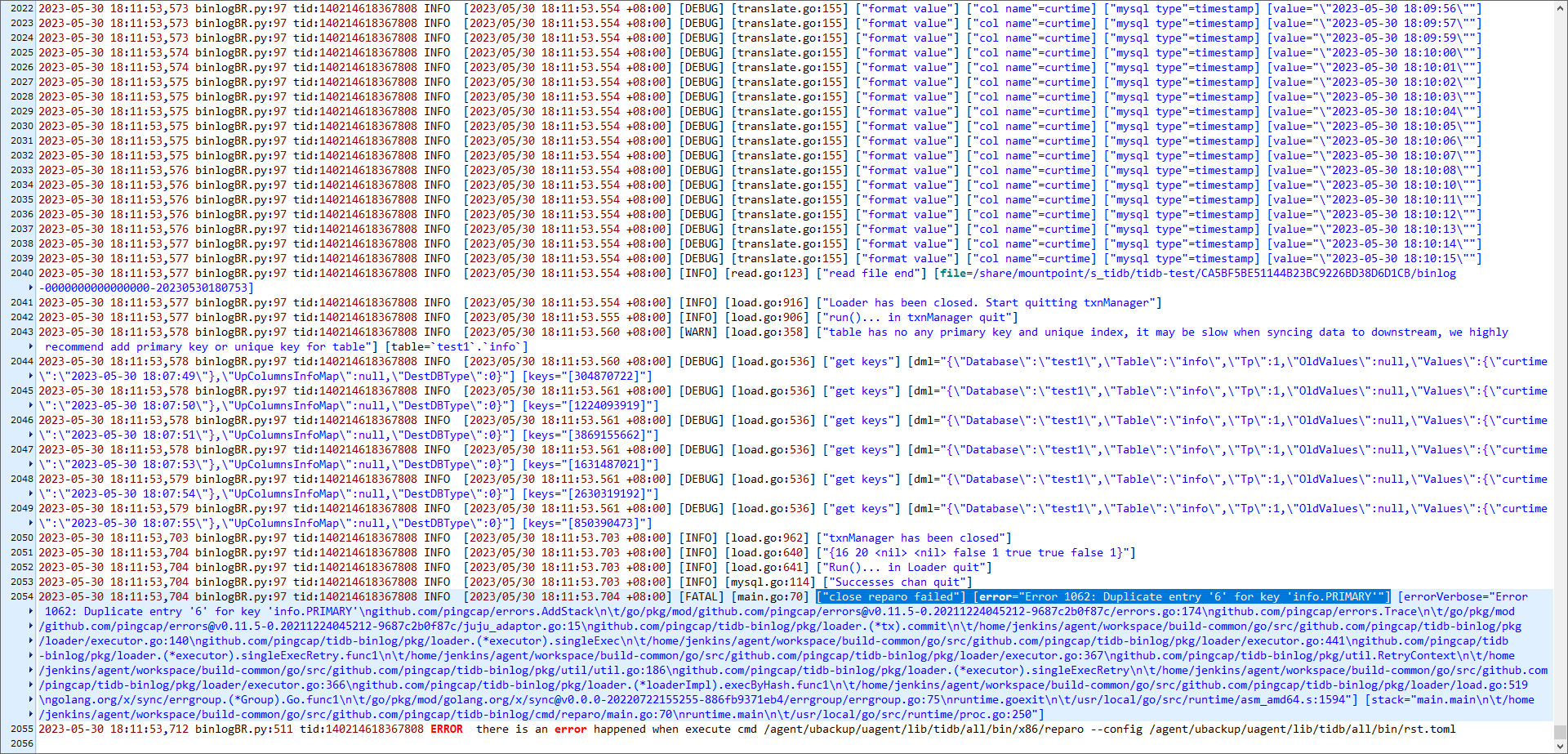 恢复失败,报错[“close reparo failed”] [error=“Error 1062: Duplicate entry ‘6’ for key ‘info.PRIMARY’”]