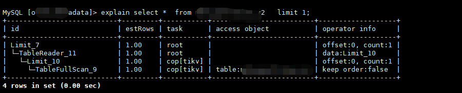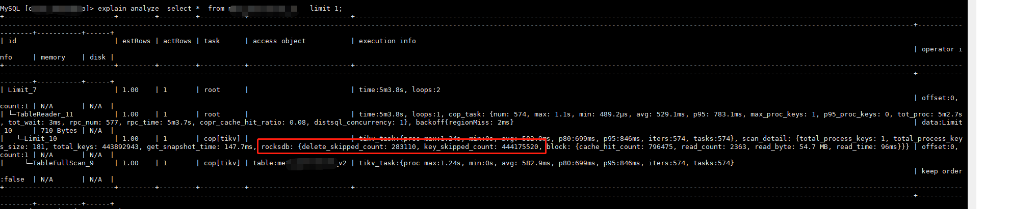 tikv_task:{time:1ms, loops:1}, scan_detail: {total_process_keys: 1, total_process_keys_size: 299, total_keys: 2, get_snapshot_time: 71.9µs, rocksdb: {key_skipped_count: 1, block: {cache_hit_count: 14}}}