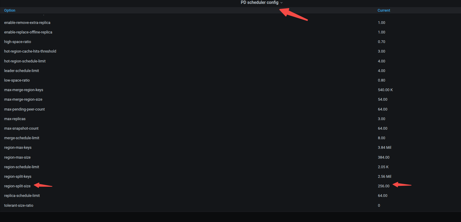 这样重启服务是可以的,但是没搞懂为什么grafana面板中PD面板的CLUSTER, 里面的pd secheduler config显示一直都是默认的256MB