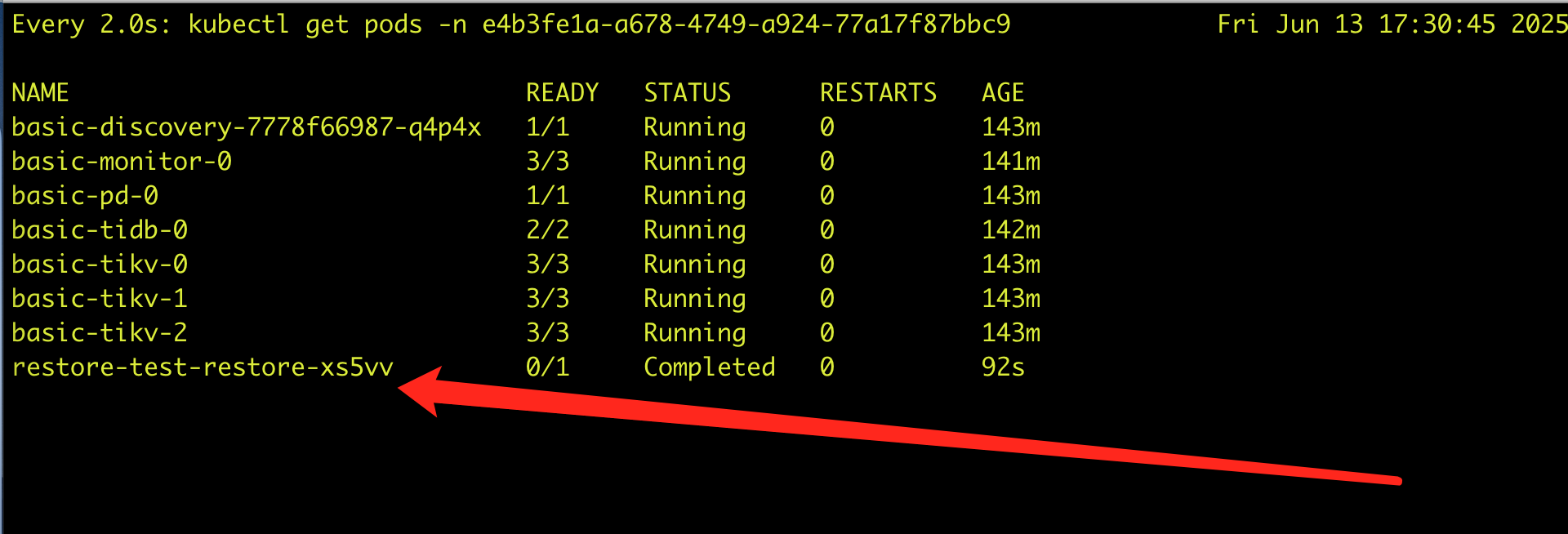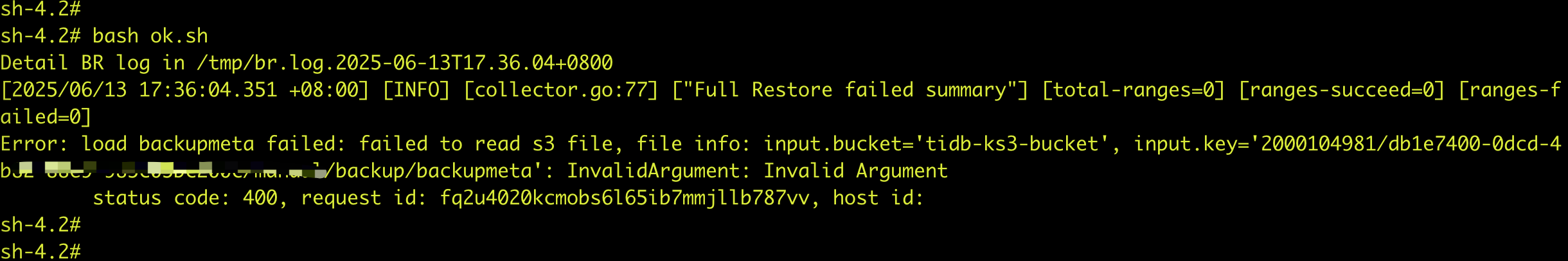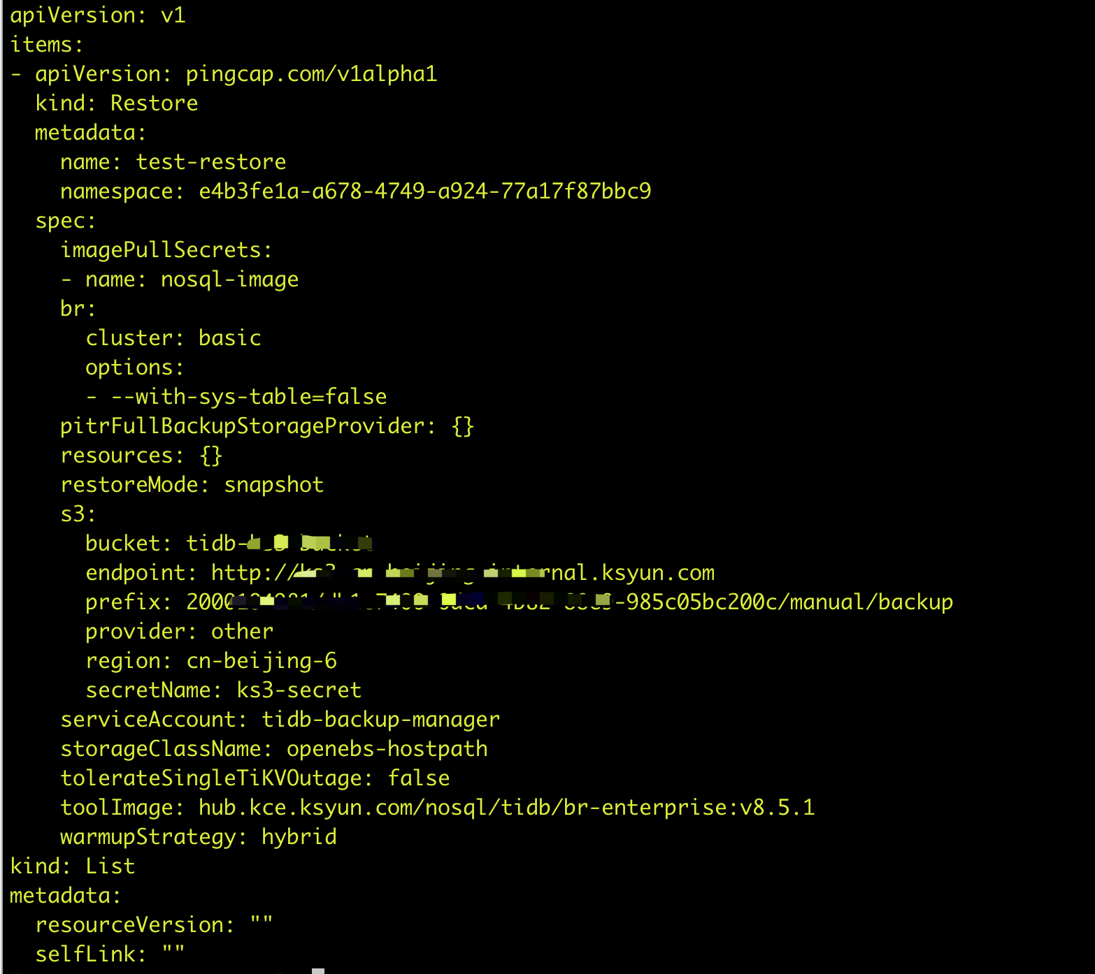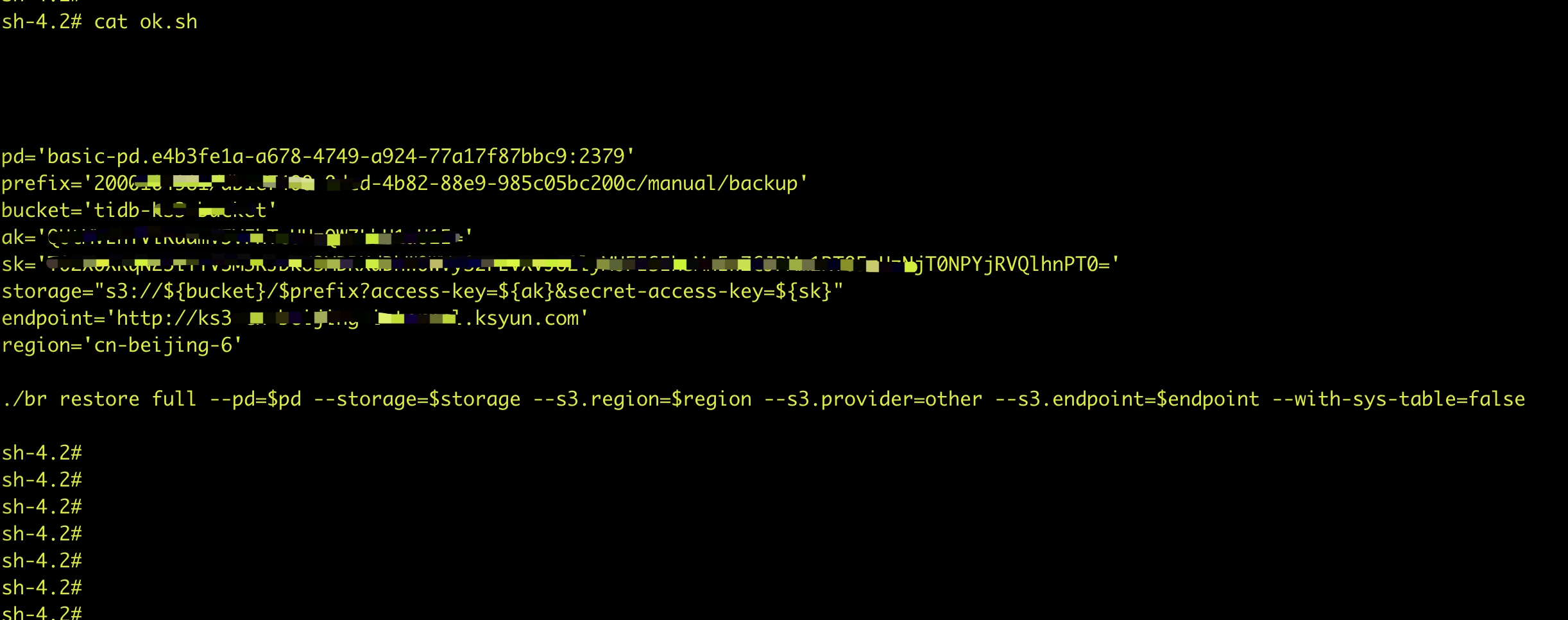 I0613 17:29:16.450321 11 restore.go:131] Running br command with args: [restore full --pd=basic-pd.e4b3fe1a-a678-4749-a924-77a17f87bbc9:2379 --storage=s3://tidb-k/d-4b82-88e9-985c05bc200c/manual/backup --s3.region=cn-beijing-6 --s3.provider=other --s3.endpoint=http://ks3.ksyun.com --with-sys-table=false]