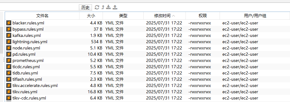 上述配置后,在集群进行 deploy/scale-out/scale-in/reload 操作时,TiUP 将读取本机 /home/tidb/prometheus_rule 路径下的自定义 rule,然后将该配置发送到 Prometheus Server,替换默认配置规则。