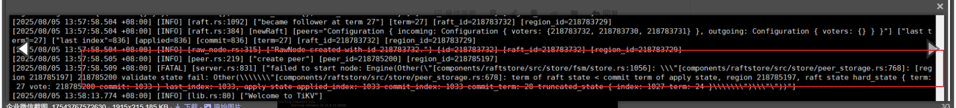 [2025/08/05 16:17:15.509 +08:00] [INFO] [lib.rs:80] ["Welcome to TiKV"]
