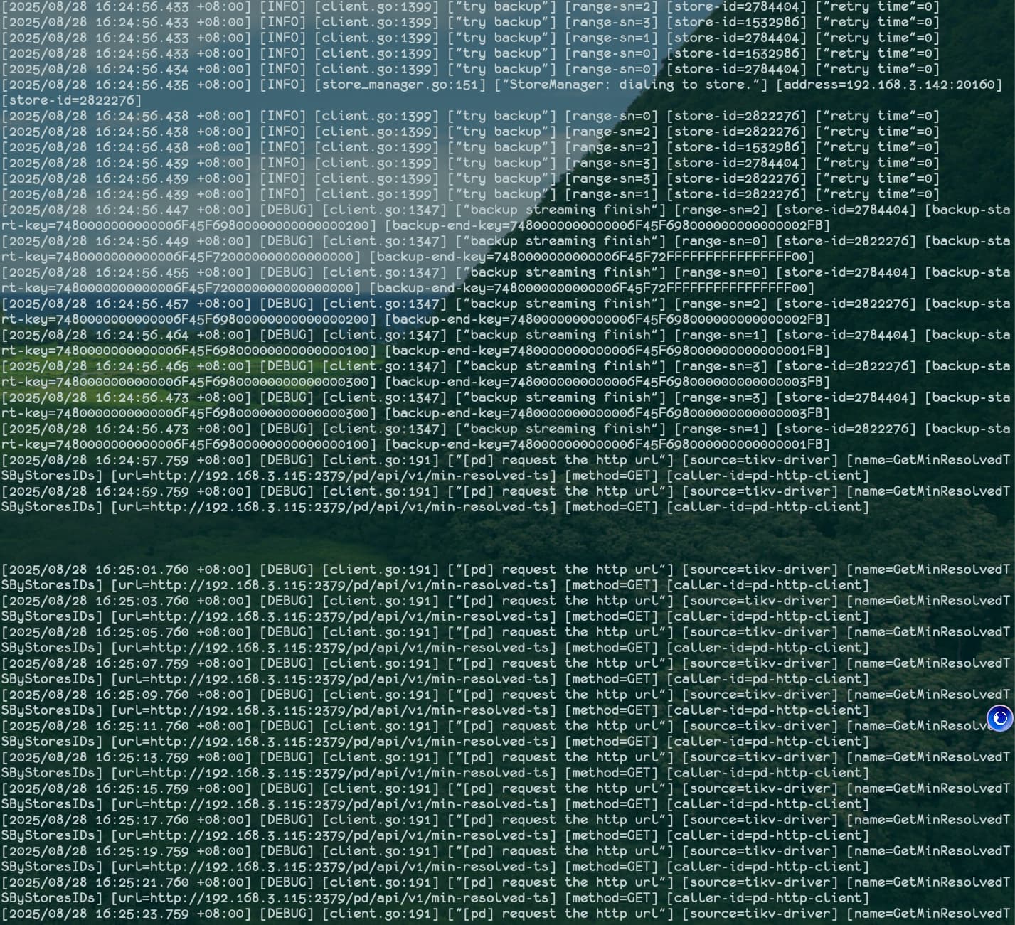 [2025/08/28 12:16:47.381 +08:00] [DEBUG] [client.go:191] ["[pd] request the http url"] [source=tikv-driver] [name=GetMinResolvedTSByStoresIDs] [url=http://192.168.3.115:2379/pd/api/v1/min-resolved-ts] [method=GET] [caller-id=pd-http-client]