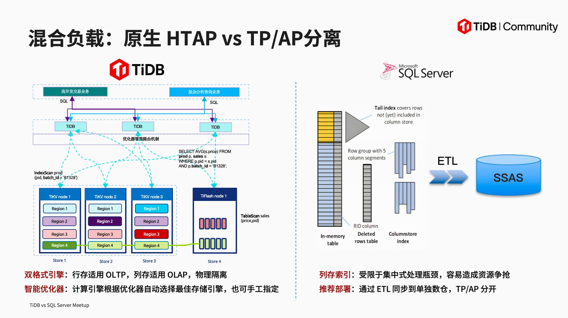 在本次分享中,刘源老师围绕 SQL Server 与 TiDB 展开深度分析,梳理了 SQL Server 的发展历程以及当下 SQL Server 用户面临许可成本高、横向扩展难、强绑定 Windows 生态等痛点问题。接着从架构、扩展性、混合负载、高可用、生态 等多维度对比二者。TiDB 以原生分布式架构实现计算与存储分离,支持水平扩展,原生 HTAP 能力通过 TiFlash 列存节点实现 TP/AP 物理隔离,基于 Raft 协议保障金融级高可用,且具备开源/兼容 MySQL 生态等特点。