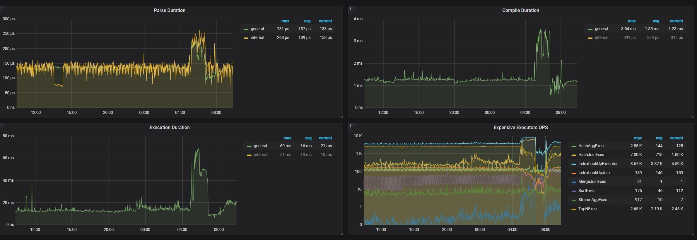 业务突增,并发是平时的3倍,3个tidb节点达到80%cpu,这个Execution Duration明显变慢,达到了70ms,平时10ms