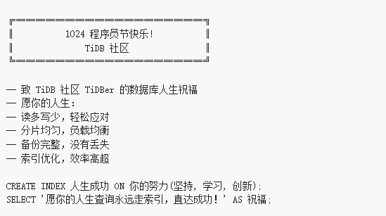 【给 TiDB 社区小伙伴们送上有意义的代码祝福语吧!】print(“TiDB,越来越好!,祝所有 TiDBer 「1024 程序员节」快乐!”)