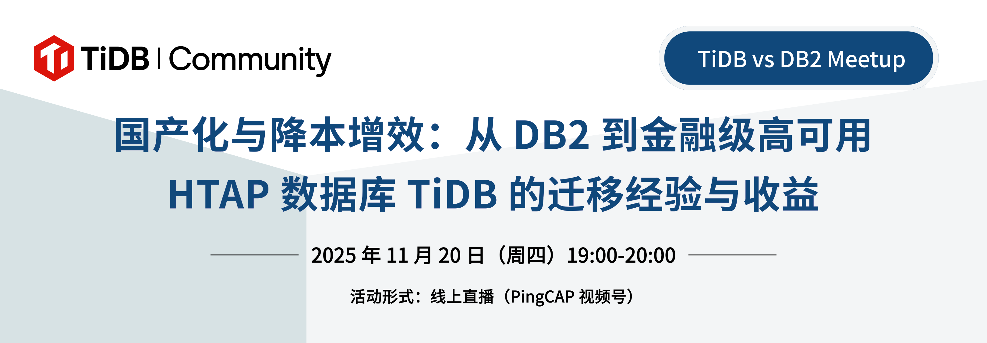 11 月 20 日 TiDB vs DB2 线上 Meetup,一起了解 TiDB 在金融级高可用、 HTAP、资源管控、多集群管理等方面如何帮助企业实现真正的降本增效,TiDB 解决方案专家马旭老师将围绕 TiDB vs DB2 核心特性对比、适配场景解析及迁移路径,结合真实用户案例与落地经验带来干货分享!欢迎 TiDBer 们参与!