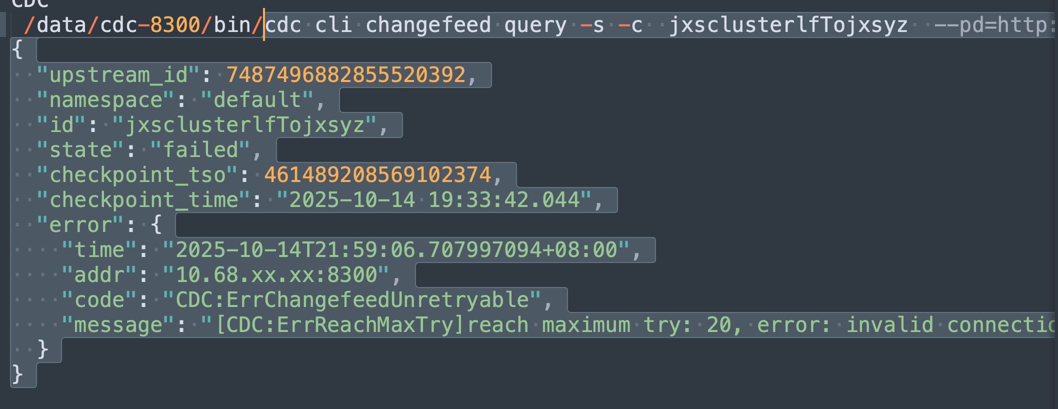 cdc cli changefeed query -s -c  jxsclusterlfTojxsyz