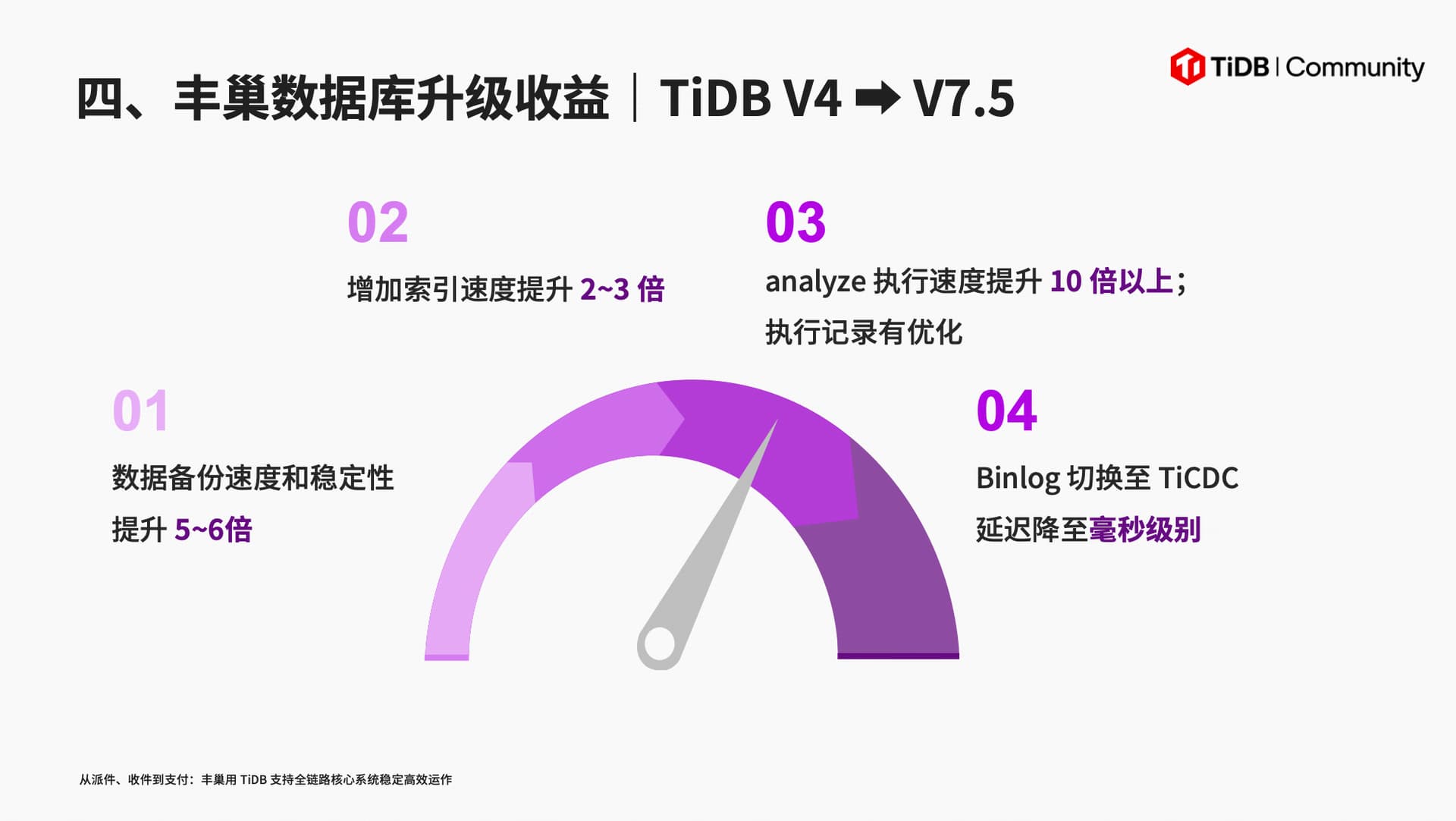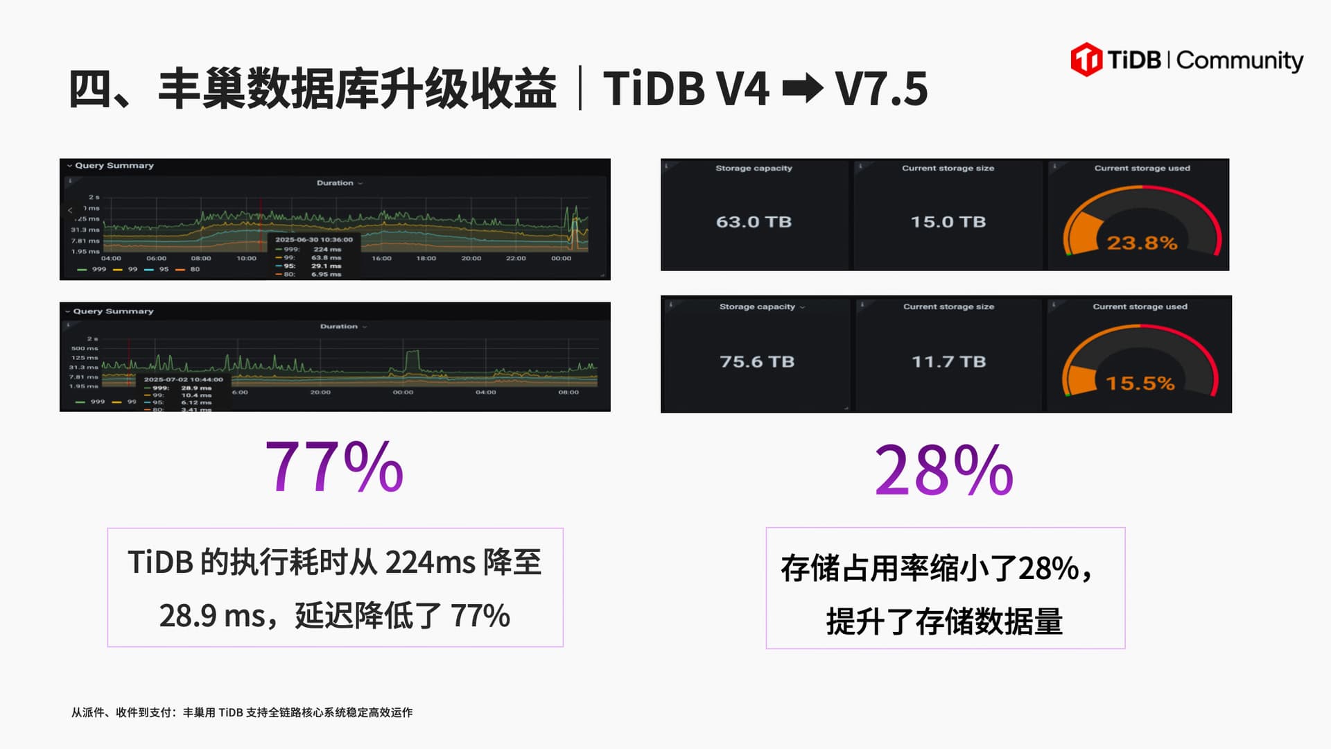 目前,丰巢已升级至 V7.5 LTS。升级后,SQL 查询效率显著提升,系统稳定性增强,TiDB V7.5 增加对分布式事务的控制,提供了更灵活的数据管理能力。新增分布式事务控制。经 SQL 兼容性、性能回归、高负载稳定性验证,业务实现零感知过渡。存储占用率缩小 28%,执行延迟降 77%,索引速度提 2 - 3 倍,analyze 速度提 10 倍以上,备份速度提 5 - 6 倍,Binlog 切换至 TiCDC 后延迟达毫秒级。