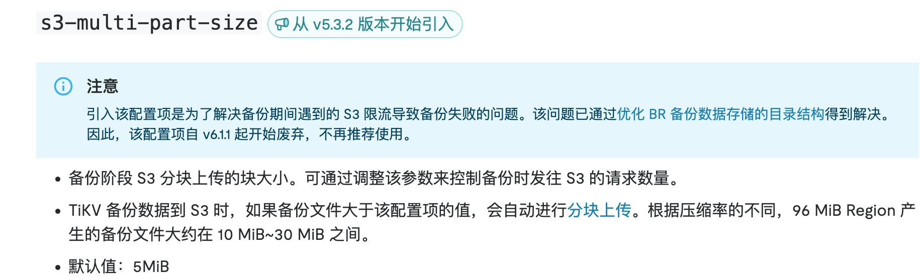 BR 备份的文件本质是 TiKV 生成的 SST 数据文件,这些文件会被直接上传到 S3。因此,限制 SST 文件的大小即可控制上传到 S3 的单个文件大小。可通过调整 TiKV 的 RocksDB 相关参数,强制减小单个 SST 文件的最大尺寸。