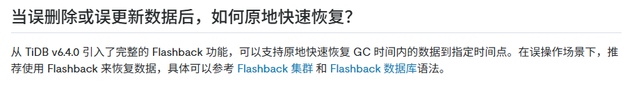 gc时间调长点,drop truncate表的直接闪回,对于删除或者update数据的,可以用select * from t as of timestamp ‘2025-11-01 10:00:00’ 查询指定时间的数据,或者dumpling备份带指定时间,获取修改前数据
