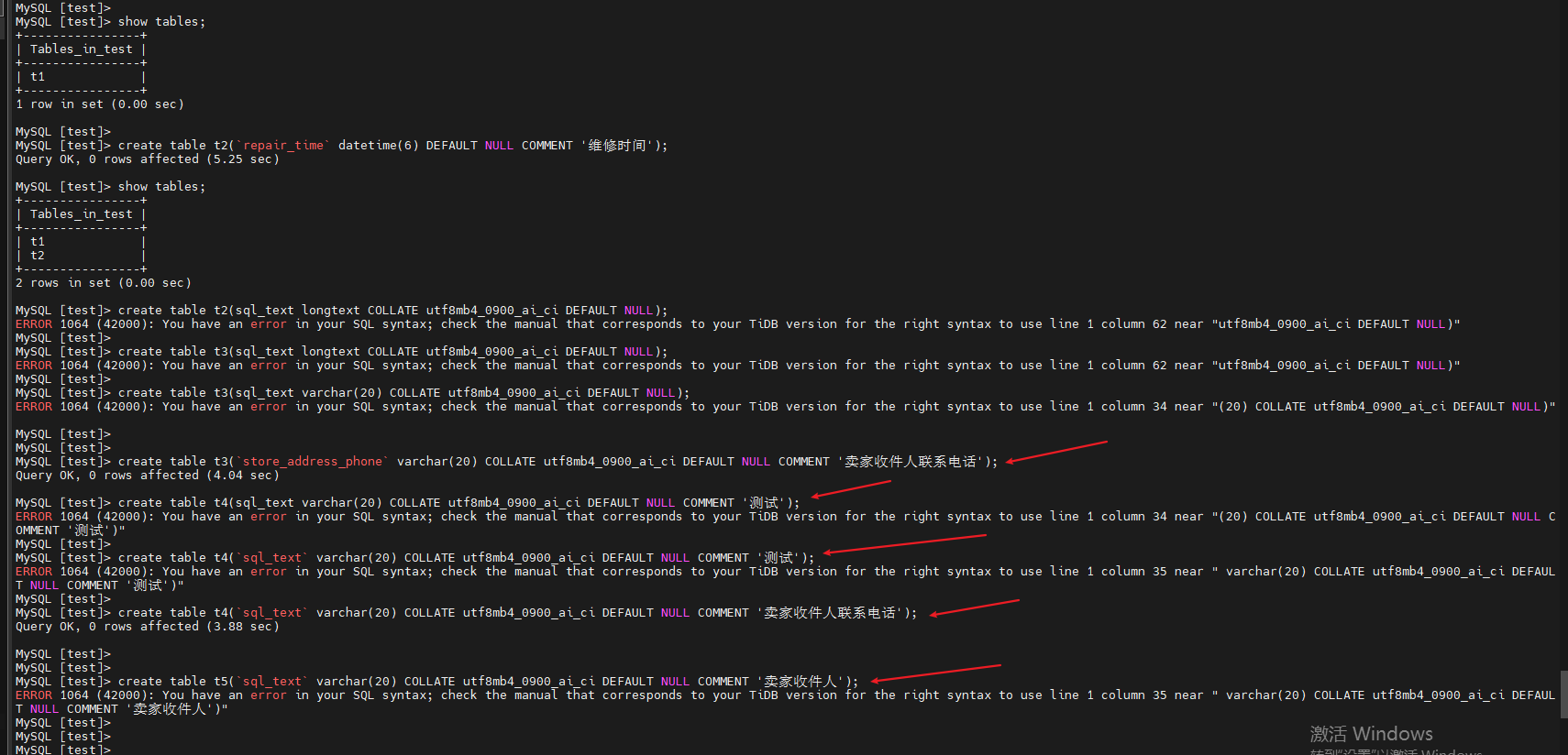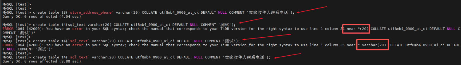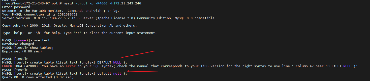 使用mysql客户端连接tidb server后再test库中尝试执行ddl建表语句发现longtext存在一些语法兼容上的问题,具体尝试过程如下图: