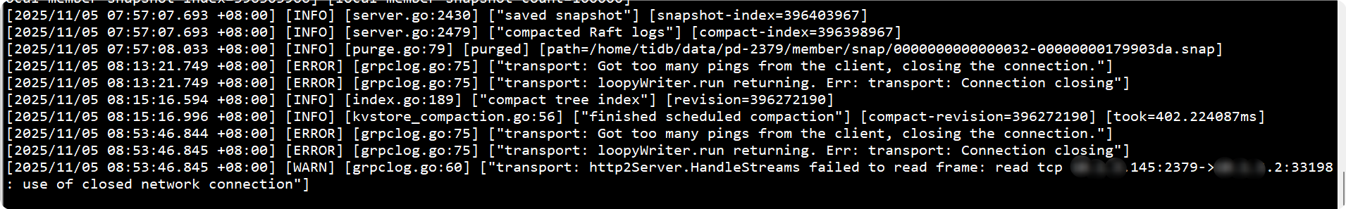 可能是该节点的某个组件(TiDB/TiKV/TiFlash/PD)实例状态异常(如未注册、心跳失联、资源超限) ,但未触发集群高可用阈值(比如 TiKV 副本数仍满足 3 副本、PD 集群多数派存活),所以整体业务不受影响