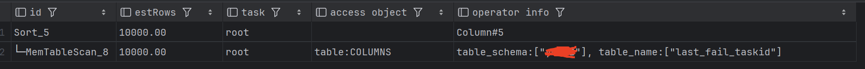 单独:SELECT * FROM information_schema.COLUMNS WHERE TABLE_SCHEMA=‘xxxxxx’ 都不报错。explain SELECT * FROM information_schema.COLUMNS WHERE TABLE_SCHEMA=‘xxx’ AND TABLE_NAME=‘last_fail_taskid’ ORDER BY ORDINAL_POSITION; 结果是: