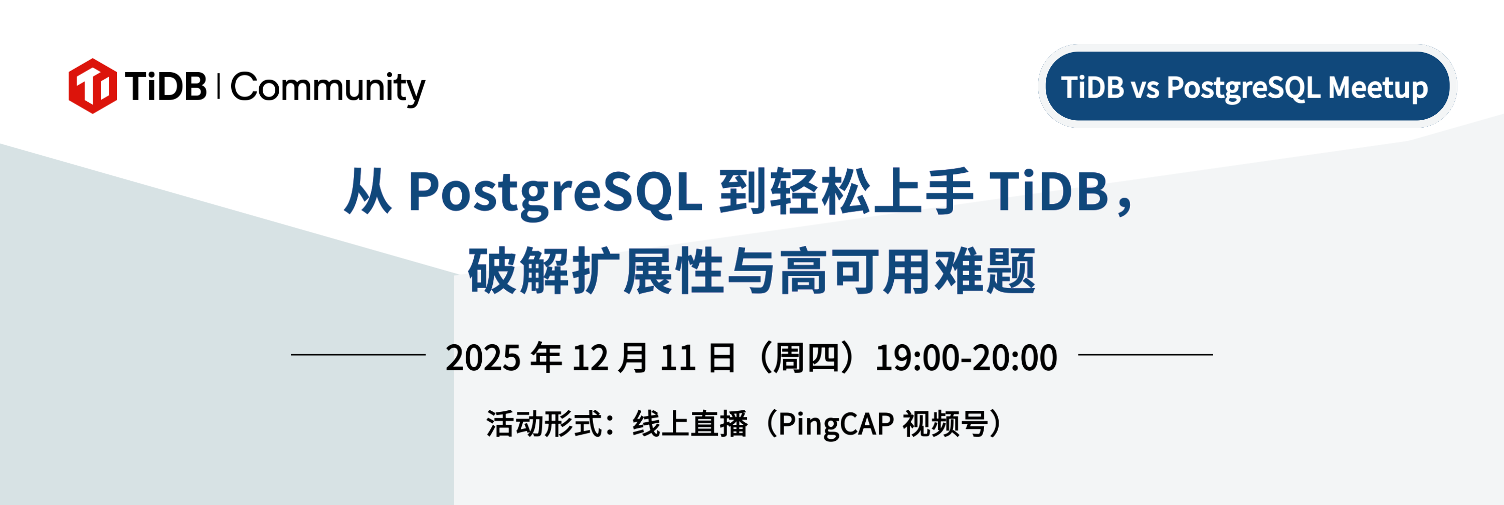 本期 Meetup,我们邀请了 TiDB 解决方案架构师石敦斌老师和我们分享如何用 TiDB 解决 PG 使用过程中的痛点,从 PG 到 TiDB 的实际客户迁移案例和流程。无论你是 PostgreSQL 的资深用户,还是正在选型数据库扩展方案的技术决策者,这场活动将为你提供实战参考和前瞻性思考。欢迎感兴趣的朋友报名参与!