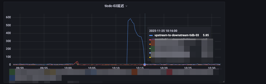 update 语句有可能会非常耗时的,你要在下游看下延迟是不是由于 update 引起的,可以通过调整参数 max-multi-update-row 和 max-multi-update-row-size 或者 batch-dml-enable 来限制下。https://docs.pingcap.com/zh/tidb/stable/ticdc-sink-to-mysql/