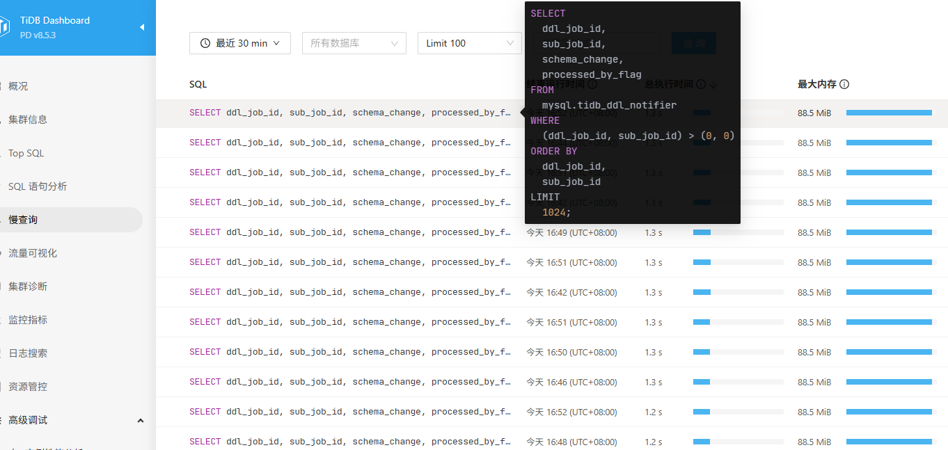 | └─TableReader_22 | 1024.00 | 171431.72 | 1024 | root | | time:1.3s, loops:1, cop_task: {num: 1, max: 763.9ms, proc_keys: 1024, tot_proc: 486ms, tot_wait: 53.3µs, copr_cache_hit_ratio: 0.00, build_task_duration: 24.9µs, max_distsql_concurrency: 1}, rpc_info:{Cop:{num_rpc:1, total_time:763.9ms}} | data:Limit_21 | 88.5 MB | N/A |
