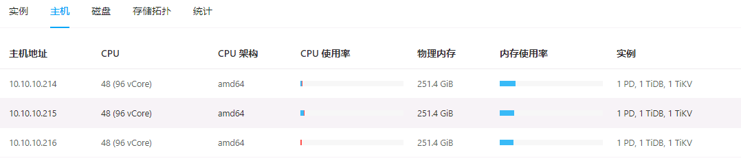 【资源配置】进入到 TiDB Dashboard -集群信息 (Cluster Info) -主机(Hosts) 截图此页面