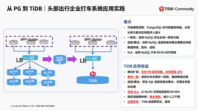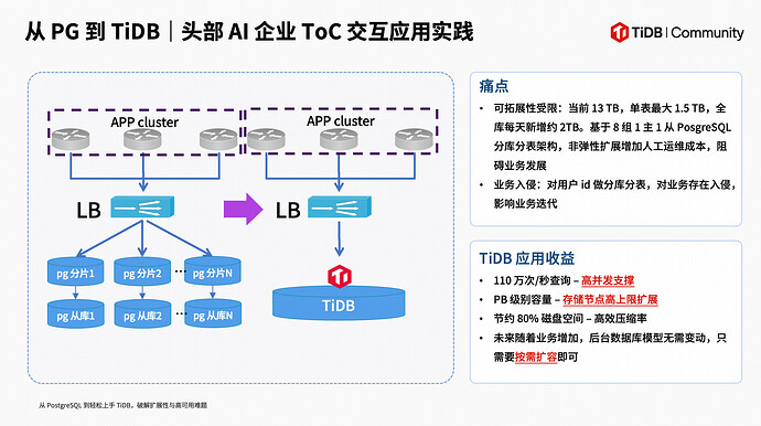 从 PG 迁移到 TiDB 不仅是架构升级,更是通过分布式能力、HTAP 特性、简化运维与全球化支持,为业务爆发式增长提供稳定可靠的数据库支撑,同时降低技术栈复杂度与整体成本。