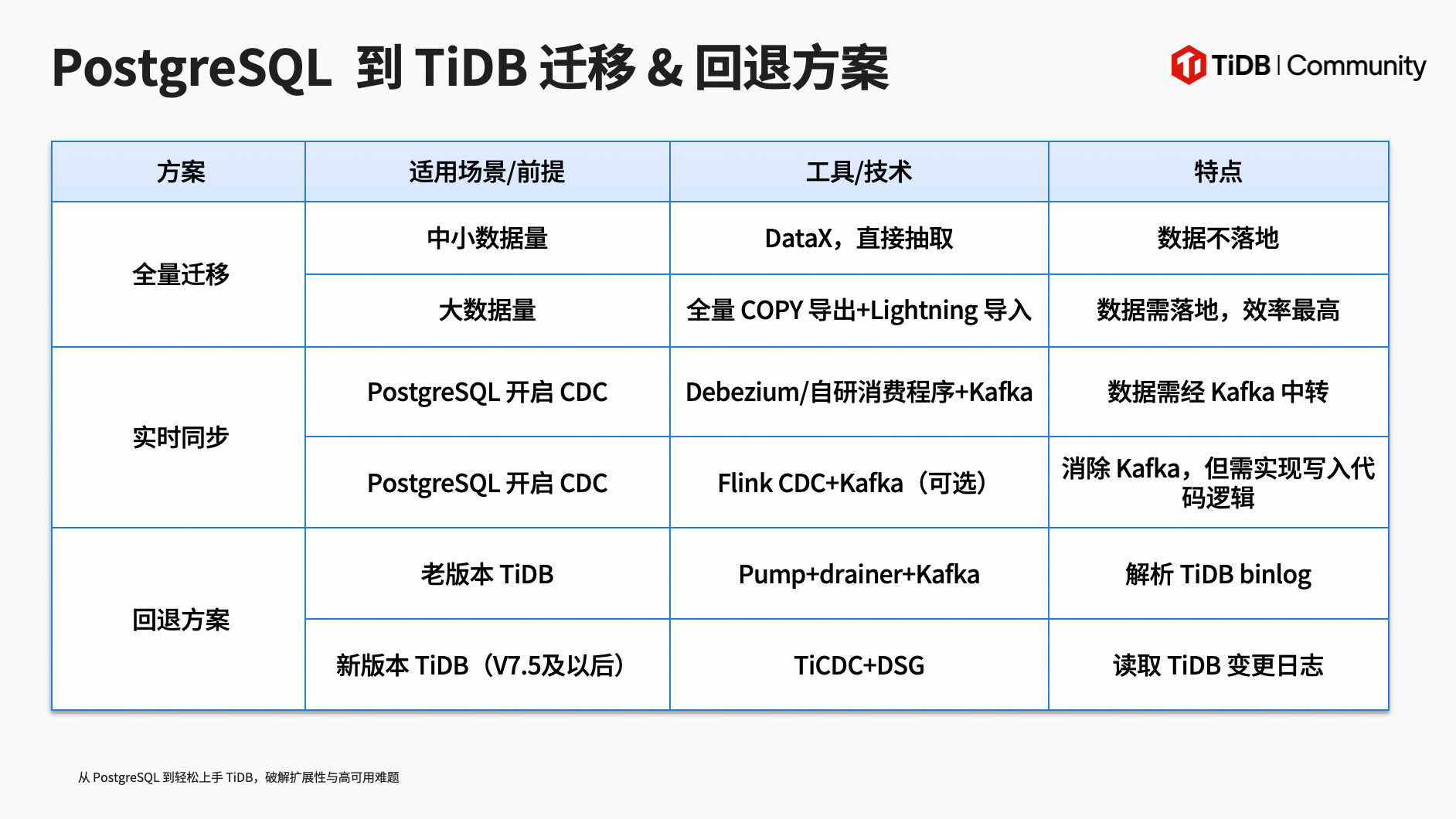 分享明确了 PG 到 TiDB 的成熟迁移体系,核心流程与关键要点如下:
