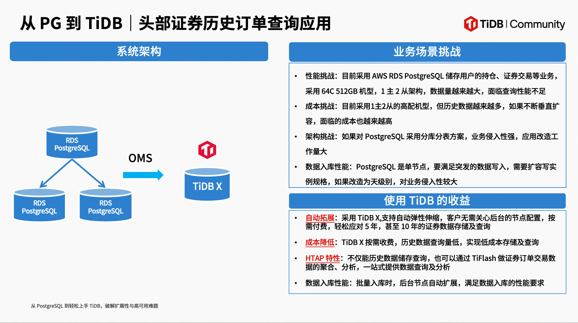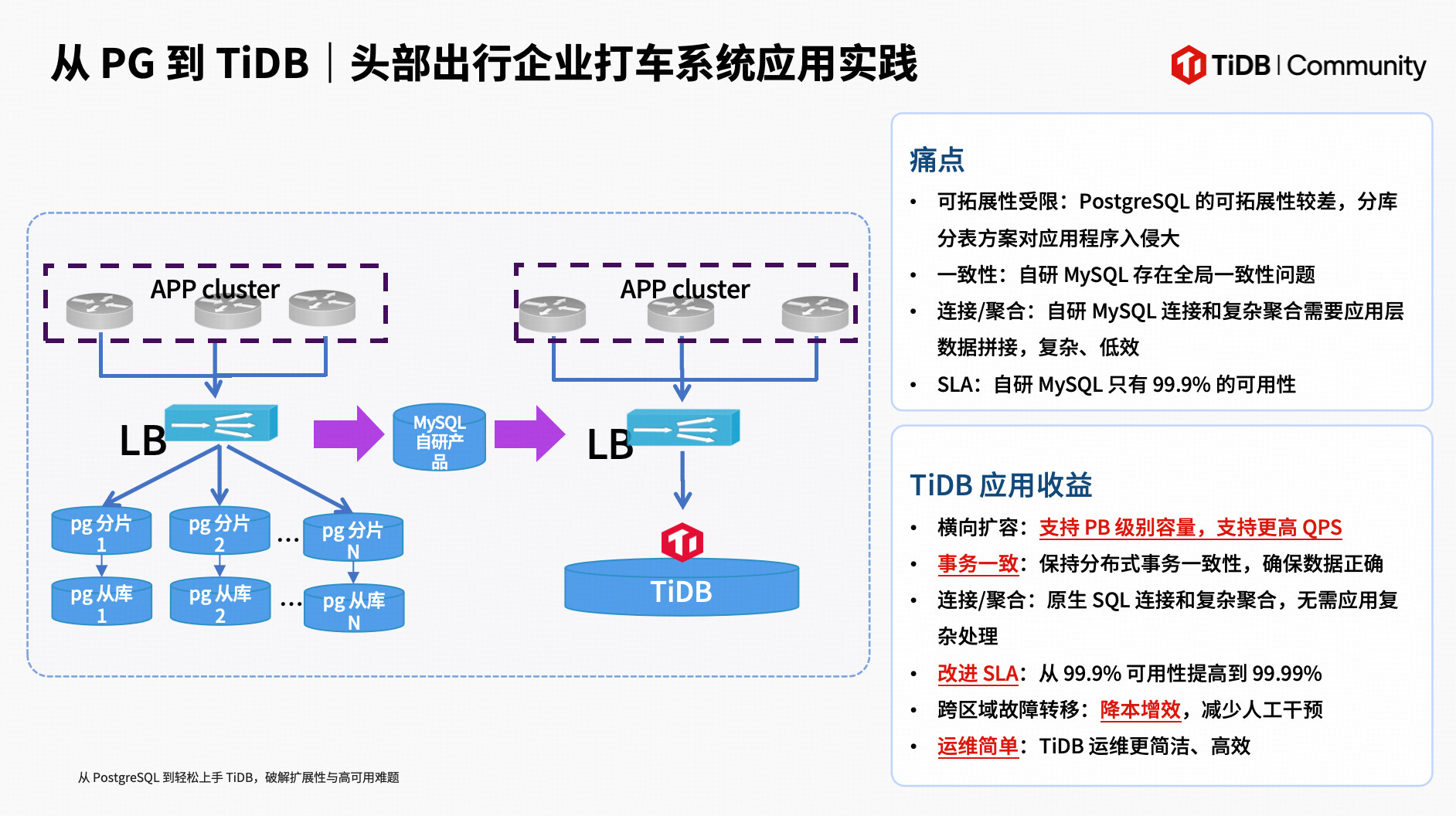内容概要:本次分享围绕“破解 PG 扩展性与高可用难题,平滑迁移 TiDB”展开,从痛点分析、选型对比、迁移实践到价值落地,核心要点如下: