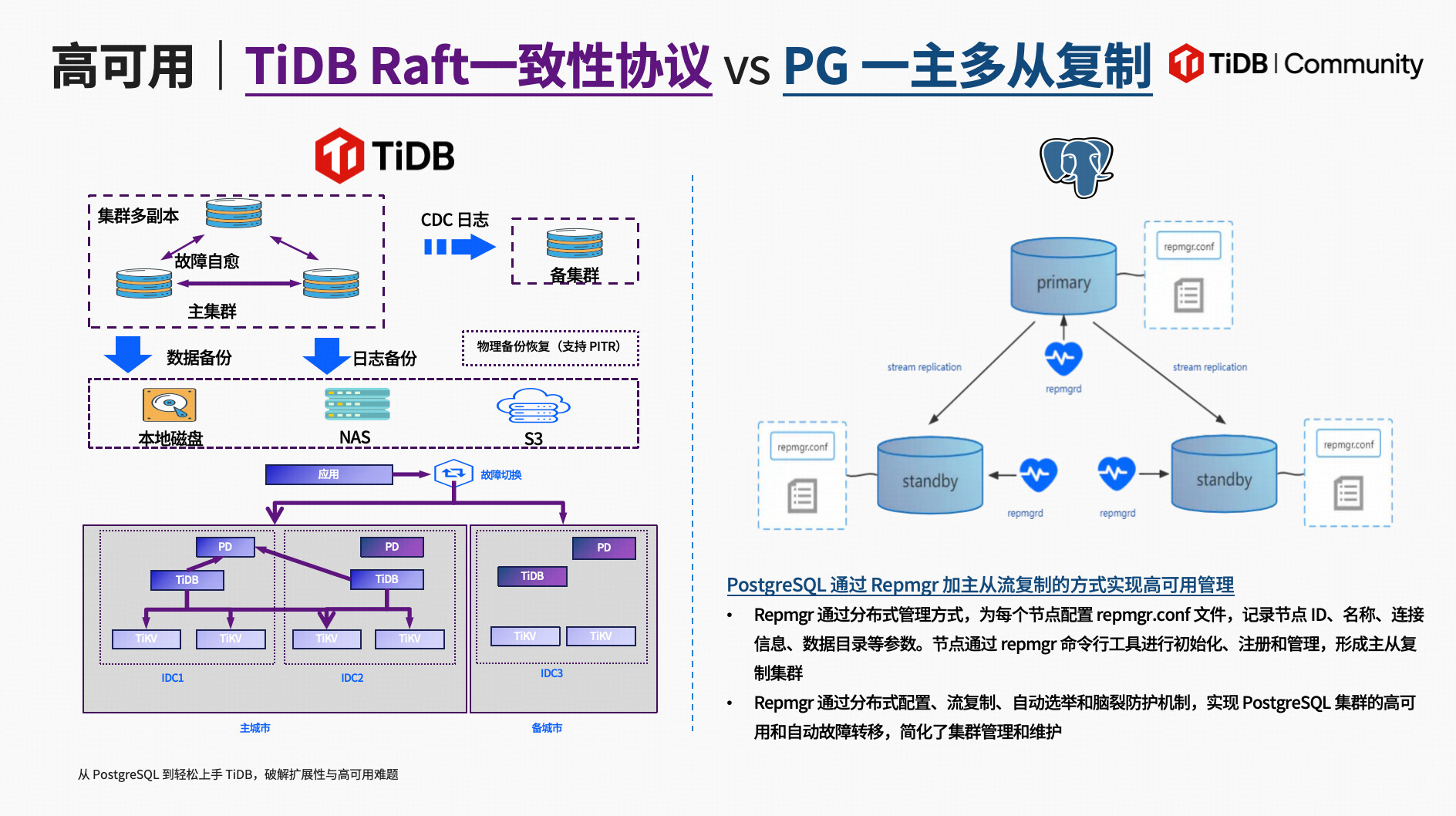 TiDB 以原生分布式架构为核心,针对 PG 痛点提供针对性解决方案,关键优势如下: