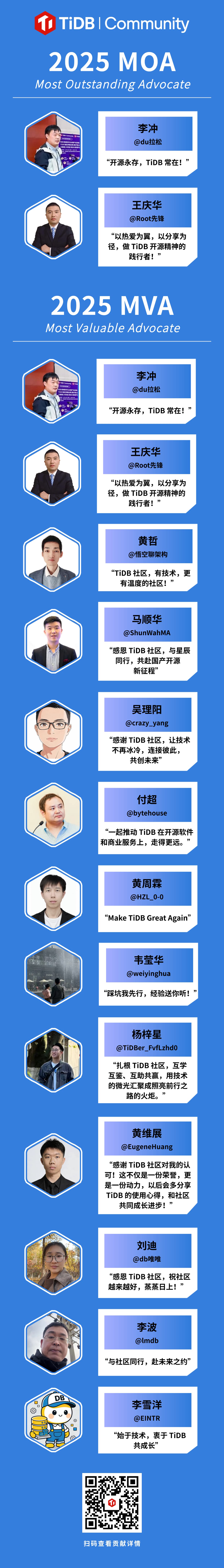 TiDB 社区 2025 年最后一批 MOA & MVA 名单正式揭晓!恭喜以下各位老师!
