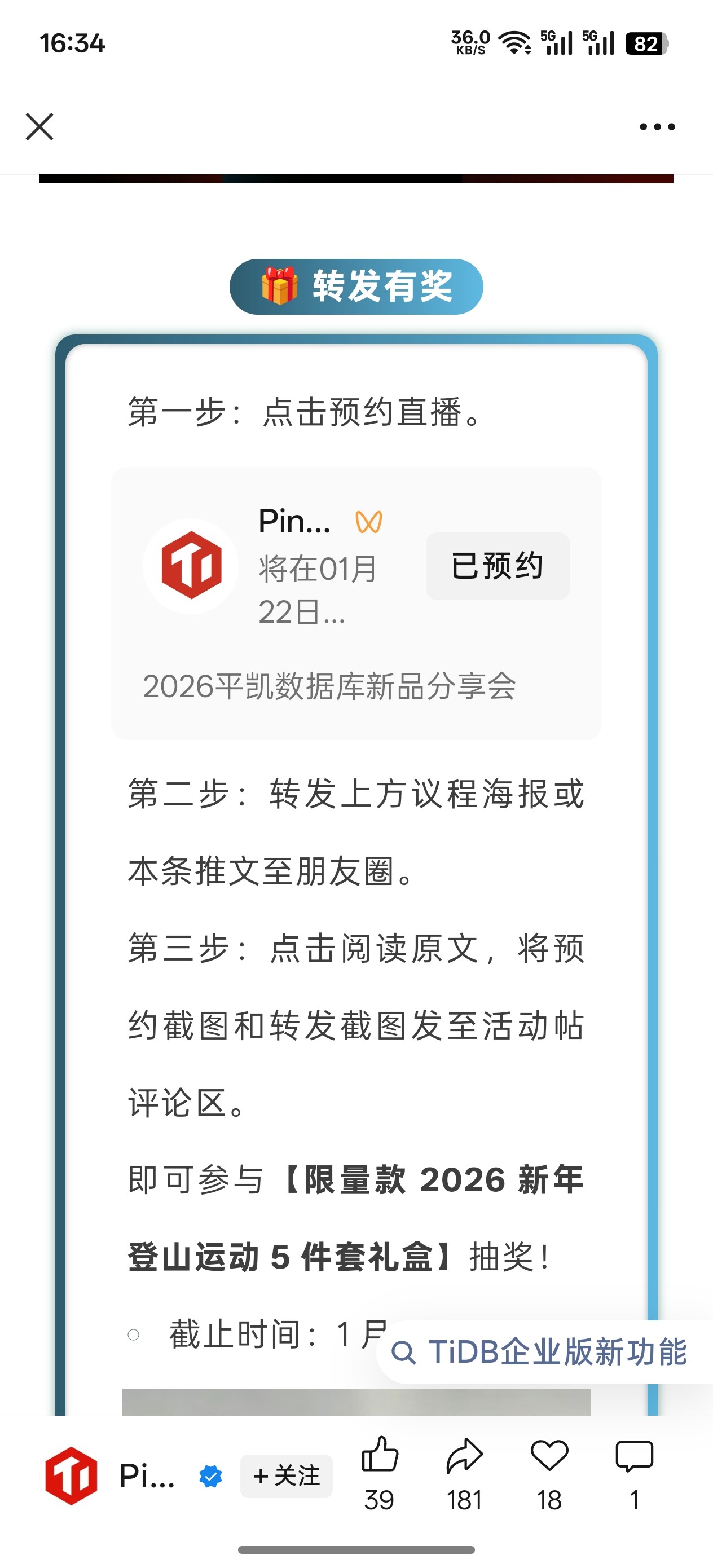 恭喜 @TiDBer_lo0ah3Dw @evanyou26 @TiDBer_bQt8evoF @TiDBer_9auCC2mR @jiayou64 5 位参与转发宣传并中奖获得限量款 2026 新年登山运动礼盒!
